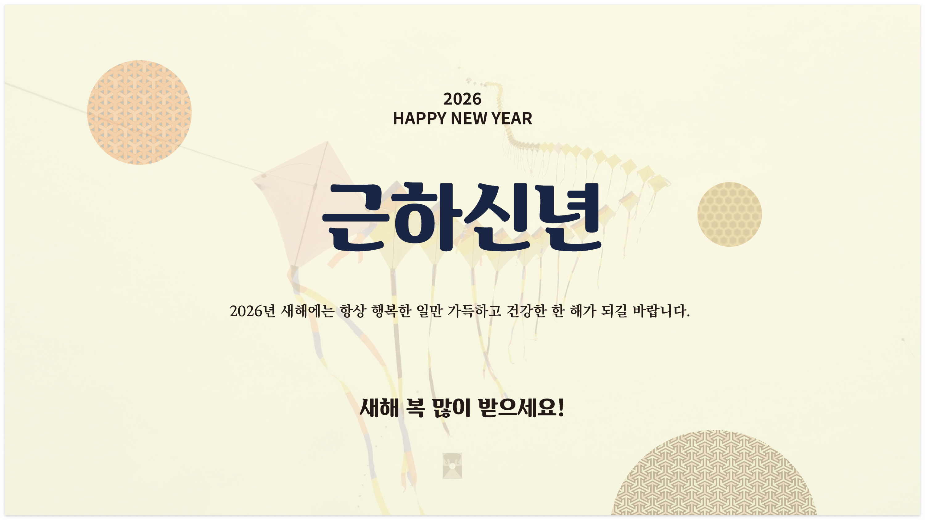 본인보다 윗사람이거나 격식을 갖춰야 할 상대에게 보낼 때 좋을 2026년 새해카드가 아닐까 생각되는데요. 아래쪽에는 '2026년 새해에는 항상 행복한 일만 가득하고 건강한 한 해가 되길 바랍니다.'라는 2026년 새해인사말을 카드에 넣어주었습니다. 2가지 색상 디자인이 준비되어 있고요. 배경으로는 새해와 잘 어울리는 연날리는 이미지가 배경으로 옅게 들어가 있습니다.